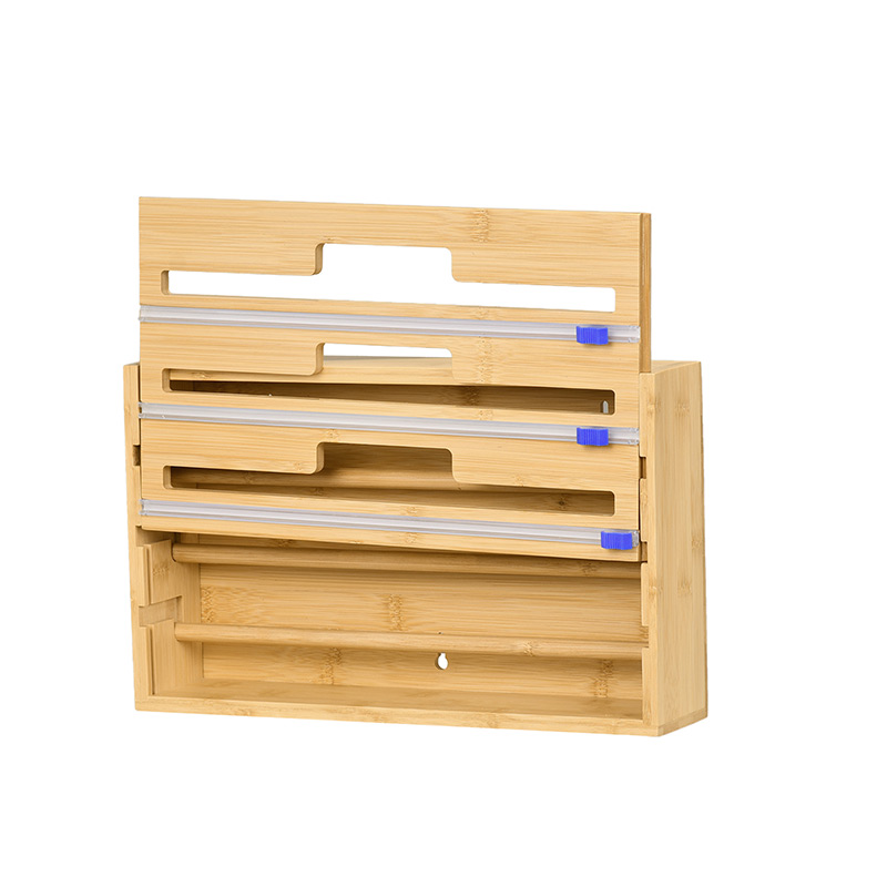 Foil and Plastic Wrap Organizer, 3 in 1 Plastic Wrap Dispenser with Cutter, Plastic Wrap, Aluminum Foil, Parchment, Wax Paper Dispenser for Drawer, Bamboo Roll Organizer Holder, Fits 12" Roll