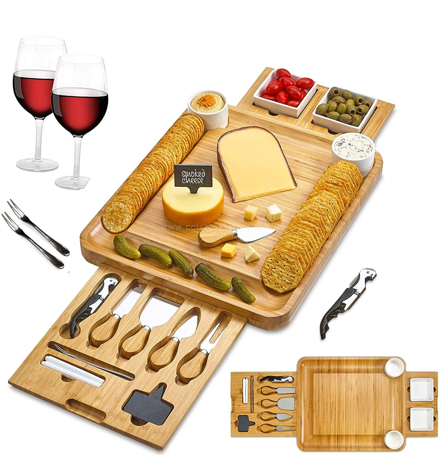 Bamboo Wood Charcuterie Magnetic 4 Slide-Out Drawers Cheese Board Set With Ceramic Bowls And Cutlery