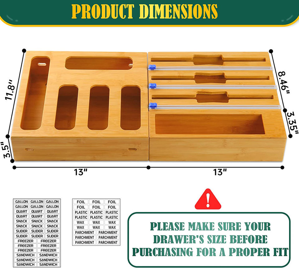 Plastic Wrap Dispenser with Cutter and Ziplock Bag organizer, 9 IN 1 Bamboo Foil and Plastic Wrap Organizer for Kitchen Drawer