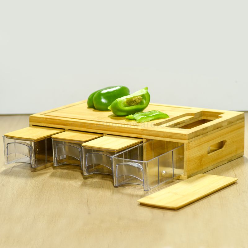 EASY to ORGANIZE and COLLECT- This chopping board comes with 4 PET organizer trays, which are durable, light, easy to move. The cutting board also features integrated juice grooves to catch excess juices and dripping from spilling onto your counter or table.
